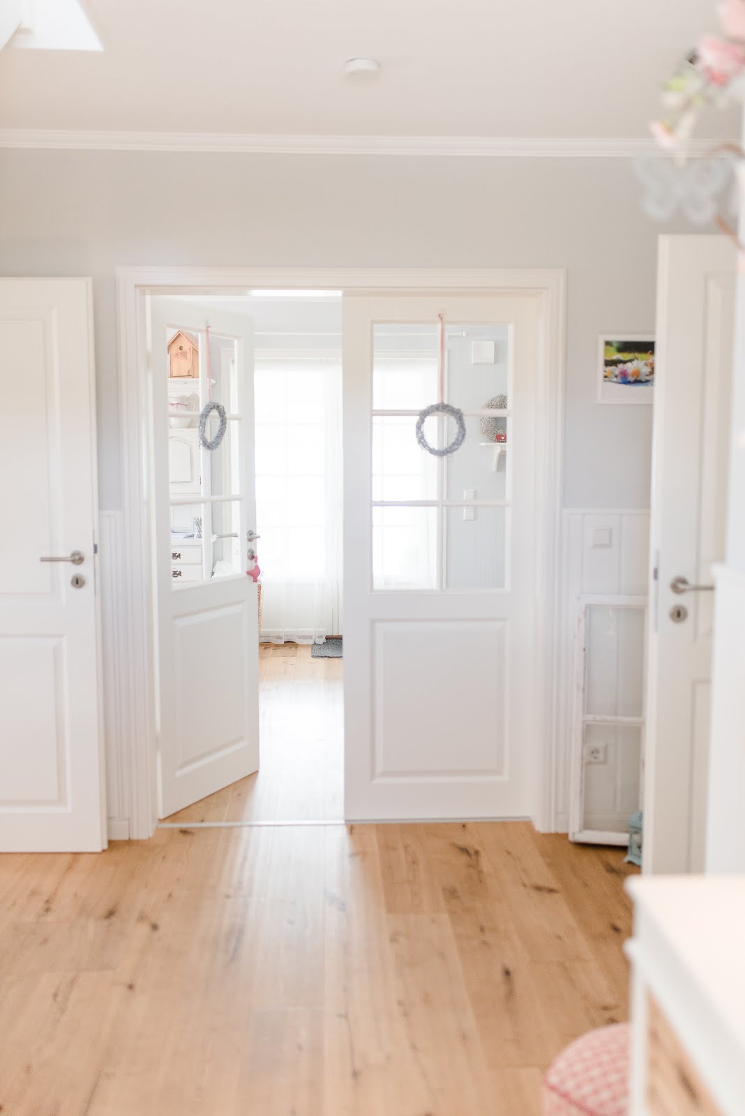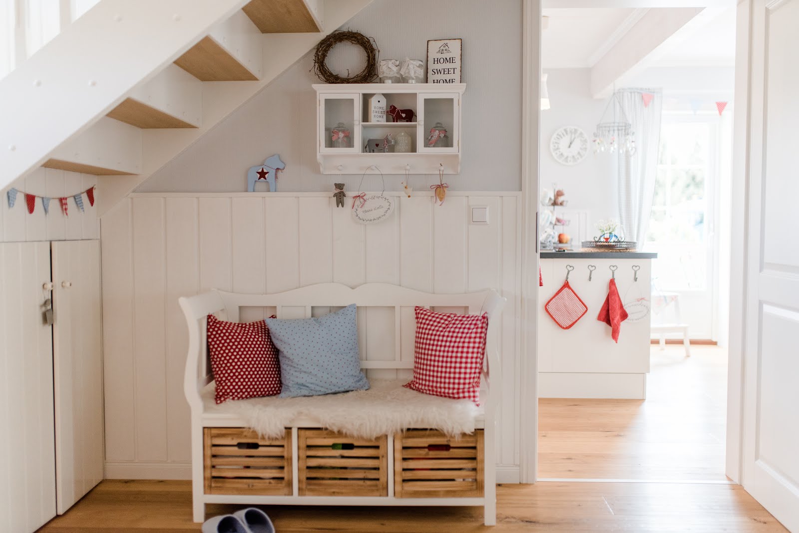 die Diele, das Treppenhaus und der Allroom Eures Schwedenhauses sind so unglaublich liebevoll eingerichtet. Die wunderschönen weißen Kleinmöbel, die du allesamt so zauberhaft dekoriert hast, die hellen Farben in Verbindung zu den Naturtönen von Boden, Handlauf und Treppenstufen, die liebevolle Deko in pastelligen Farben kombiniert mit roten Farbtupfern in Kissen, Vorhängen und Bändern, … das alles wirkt so wunderbar harmonisch und liebevoll – ein Schwedenhaus wie aus dem Bilderbuch!