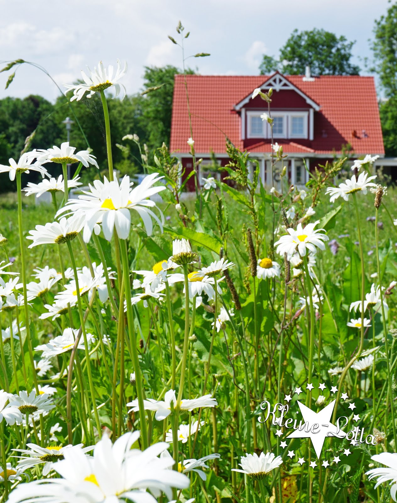 Anscheinend stört das Wetter aber weder deine Rosen, die sich so üppig blühend den Widrigkeiten entgegen stemmen. Noch deine Clematis und auch die wunderschöne Wildblumenwiese halten wacker stand. Gerade Margeriten wären ja für die Blumenkränze das NonplusUltra…perfekt!!